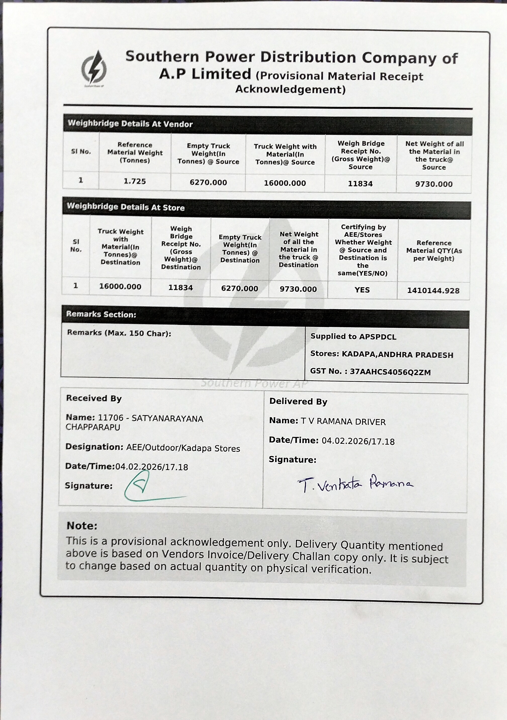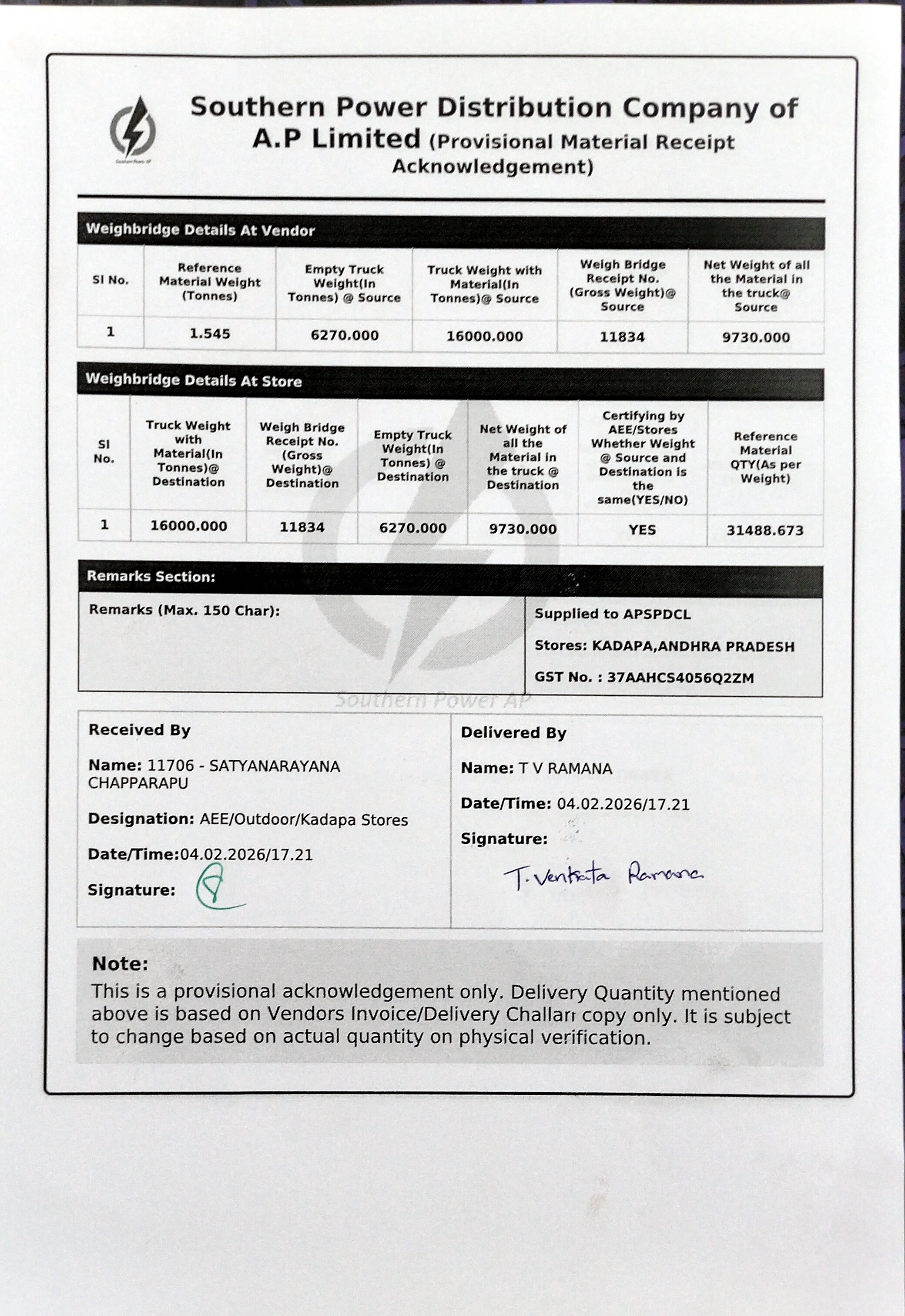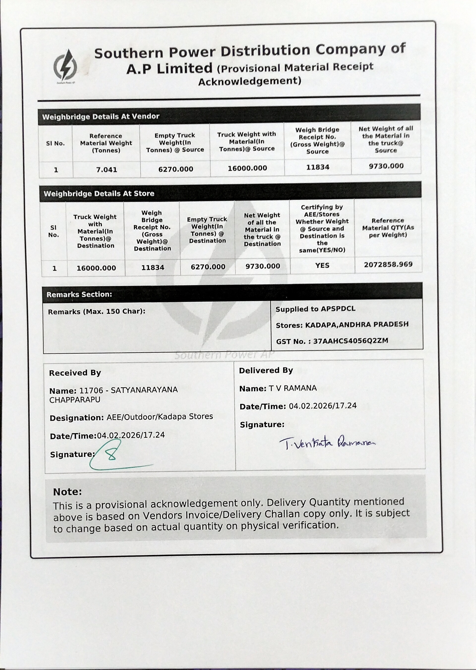 | 10 | 25.06.2025 | 5100007982 | 1 | 17/2025-26 | 212303 | Mokshasri Electricals | AAD-ADE 2 P&MM | FBG00040 | DP SET FOR LT IIIA HT METER | SET | 28.01.2026 | 4100015542 | 1 | 30.07.2025 | KADAPA,ANDHRA PRADESH | 9440811917 | 1 | 5.000 | 03.02.2026 | 40 | guntur, Andhra Pradesh | 04.02.2026 / 15:20 | 430 | 04.02.2026 / 23:56 | venkataramana | 8074511442 | AP39UW0599 | Download E-way Bill Copy | 1.545 | 6270.000 | Empty Truck Weight At Vendor | 16000.000 | 11834 | Truck Weight with Material At Vendor | 9730.000 | 16000.000 | 11834 | Truck Weight with Material At Store | 6270.000 | Empty Truck Weight At Store | 9730.000 | YES | 31489 | 5 | Vehicle Photo | Download Received Material Photo | T V RAMANA | 04.02.2026 | 17:36 | Signed Acknowledgement | SATYANARAYANA CHAPPARAPU | 9440407935 | ||