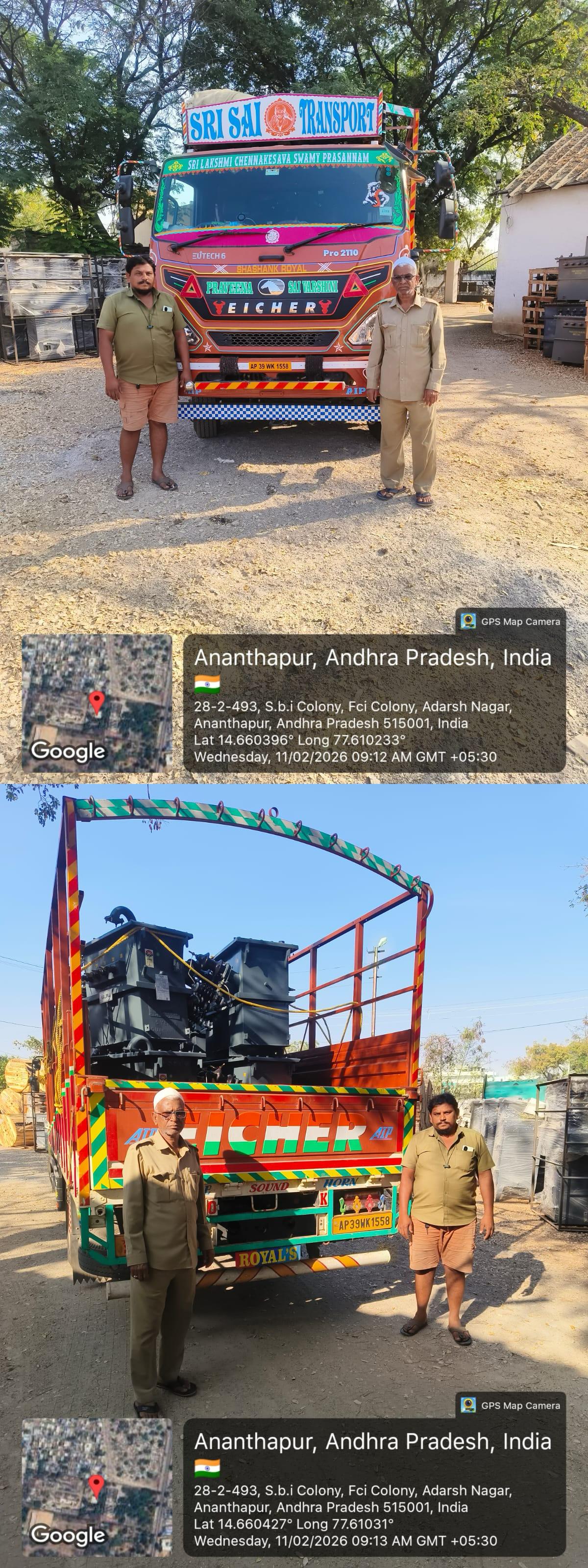 | 29 | 10.04.2025 | 5100007847 | 1 | SP:99/24 | 212399 | Vajra Transpower Pvt Ltd | AAA-ADE 3 P&MM | DTC30153 | 3PH 63 KVA DTR Amor /CRGO AL BEE 5 Star | EA | 28.01.2026 | 4100015544 | 1 | 31.10.2025 | GUDUR,ANDHRA PRADESH | 9440812012 | 2 | 8.000 | 29.01.2026 | 860/25-26 | Pashamailaram, Telangana | 29.01.2026 / 13:07 | 559 | 30.01.2026 / 00:17 | TRANSINDIALOGISTICS | 9121154544 | AP05TM3906 | Download E-way Bill Copy | 0.000 | 0.000 | No Attachment | 0.000 | No Attachment | 0.000 | None | No Attachment | No Attachment | None | 8 | Vehicle Photo | Download Received Material Photo | P Mangaraju | 30.01.2026 | 15:24 | Signed Acknowledgement | GURU PRASAD PULI | 7382623175 | |||||||