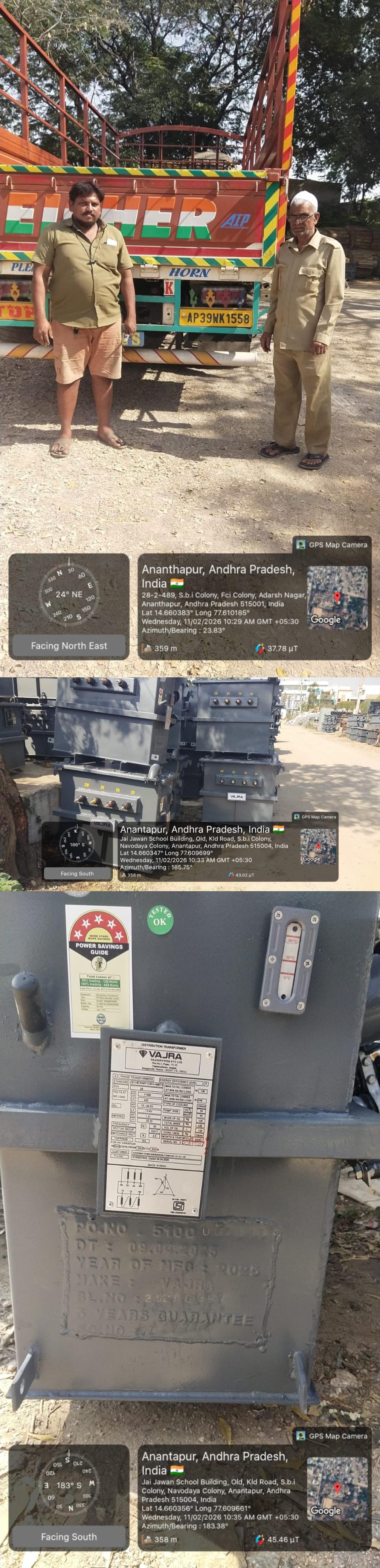 | 26 | 10.04.2025 | 5100007847 | 1 | SP:99/24 | 212399 | Vajra Transpower Pvt Ltd | AAA-ADE 3 P&MM | DTC30153 | 3PH 63 KVA DTR Amor /CRGO AL BEE 5 Star | EA | 28.01.2026 | 4100015544 | 2 | 31.10.2025 | CHITTOOR,ANDHRA PRADESH | 9440811853 | 1 | 10.000 | 29.01.2026 | 863/25-26 | Pashamailaram, Telangana | 30.01.2026 / 14:59 | 597 | 31.01.2026 / 02:55 | TRANSINDIALOGISTICS | 9121154544 | AP39X4509 | Download E-way Bill Copy | 0.000 | 0.000 | No Attachment | 0.000 | No Attachment | 0.000 | None | No Attachment | No Attachment | None | 10 | Vehicle Photo | Download Received Material Photo | Trans India Logistics | 30.01.2026 | 16:44 | Signed Acknowledgement | MOHAN RAO MURAHARI | 8985911893 | |||||||